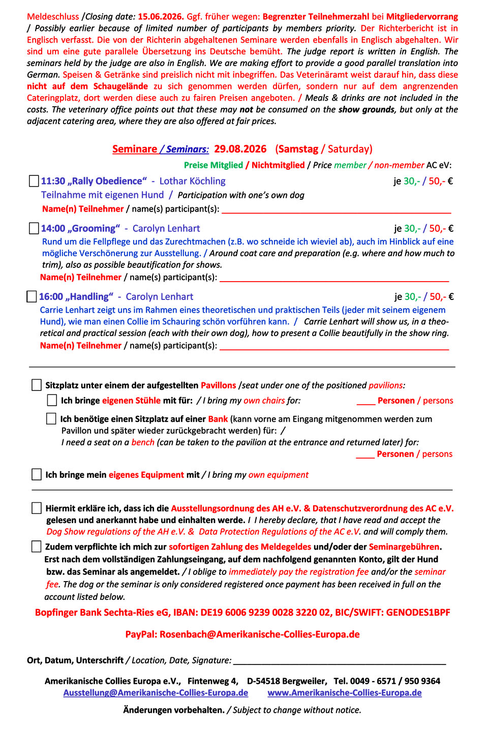 Die Schau findet draußen statt. Während der Veranstaltung werden Fotos gemacht, die später öffentlich gestellt werden, z.B. auf unserer Vereinshomepage und den Sozialen Median. Es wird darum gebeten eigene Sitzgelegenheiten mitzubringen und auch gerne Schutz gegen zu viel Sonne oder Regen. Für Essen & Getränke sorgt der ortsansässige Verein der Hundefreunde Oberhausen-Rheinhausen e.V..