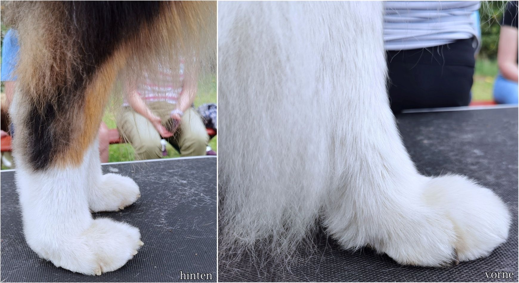 Mit zunehmender Felllänge legt nicht nur das Fell am Körper zu, sondern auch an den Pfoten. Diese sehen manchmal nicht nur ungepflegt aus, sondern fungieren auch oft als wahre Dreck-, Matsch- und mitunter Klettenfänger, so dass manch einer sich genötigt sieht hier Hand anzulegen, auch wenn der Hund nicht auf Ausstellung geht. Für eine Ausstellung kann man das Fell dort zurückschneiden, aber man muss es nicht. Manch einer probiert es dann beim Hundefriseur. Dort sollte man sehr wählerisch sein, damit man nicht nachher enttäuscht ist, wenn der Collie danach nicht mehr viel Ähnlichkeit mit dem ursprünglich angestrebten Aussehen eines Collies hat. Oben ist eine Abbildung vom Grooming Seminar auf der Ausstellung 2023, der Hund war jedoch schon vorher weit zurückgeschnitten. Insgesamt lässt man es heute eher noch länger und immer schön gerundet. Am besten vorher immer gut hochbürsten und dann zurückschneiden. Die Haare unter den Pfoten dazu noch eingekürzt und ggf. noch die Krallen etwas zurückgeschnitten. Wenn man es über das Jahr immer wieder übt, klappt es von Mal zu Mal immer besser.
