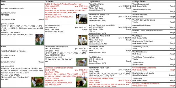 • MDR1 +/+, DM N/N, CEA N/CEA, PRA N/N, GCS folgt, IPD N/N, MH N/N, HUU N/N, DMS aa bb CC, Merle m/m