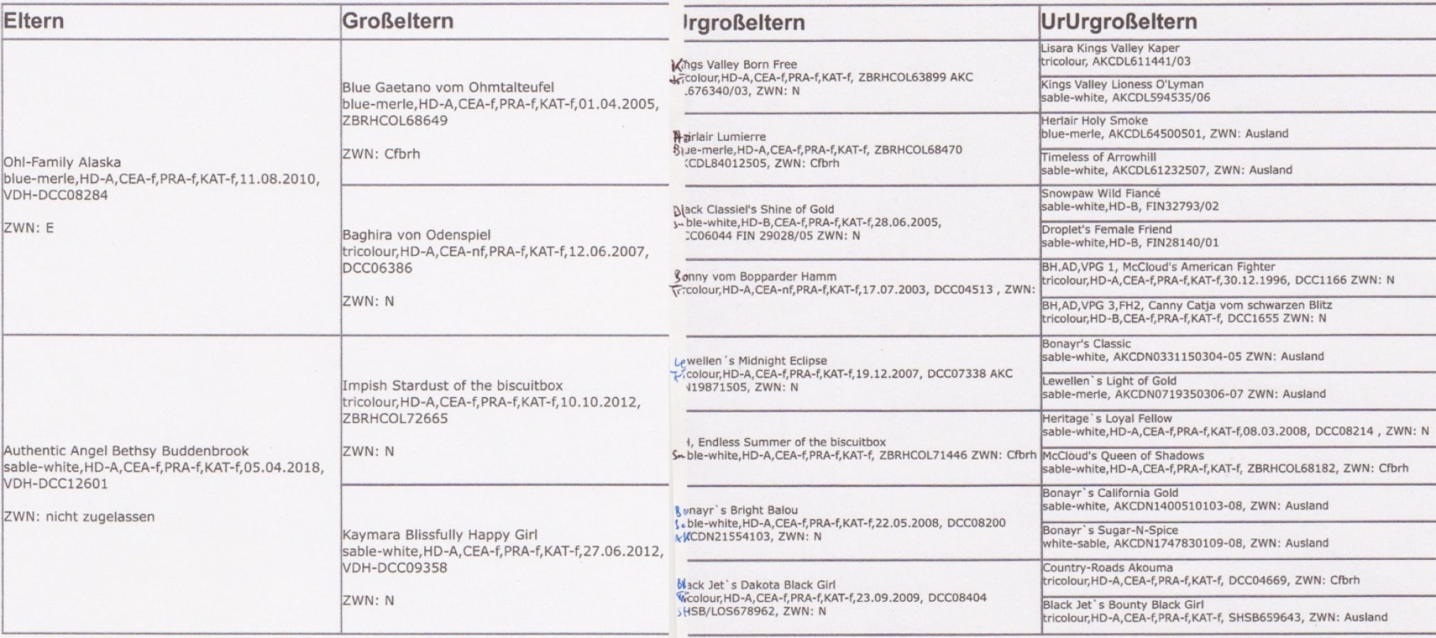 - MDR1 +/-, DM N/N, CEA N/CEA, PRA N/N, GCS folgt, IPD N/N, DMS aa bb Cc, Merle m/Mc