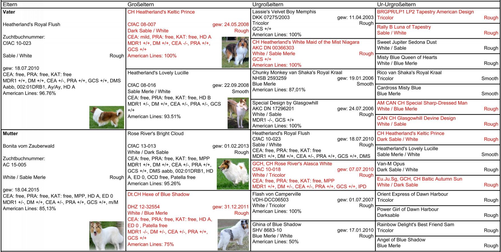 - MDR1 +/+, DM N/N, CEA N/CEA, PRA N/N, GCS N/N, DMS aa bb, Merle m/m