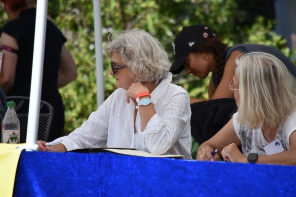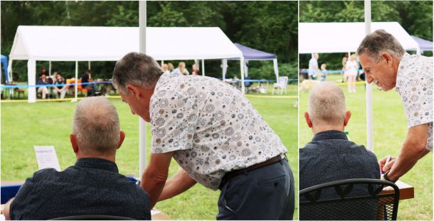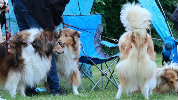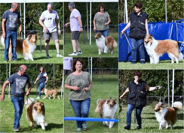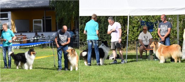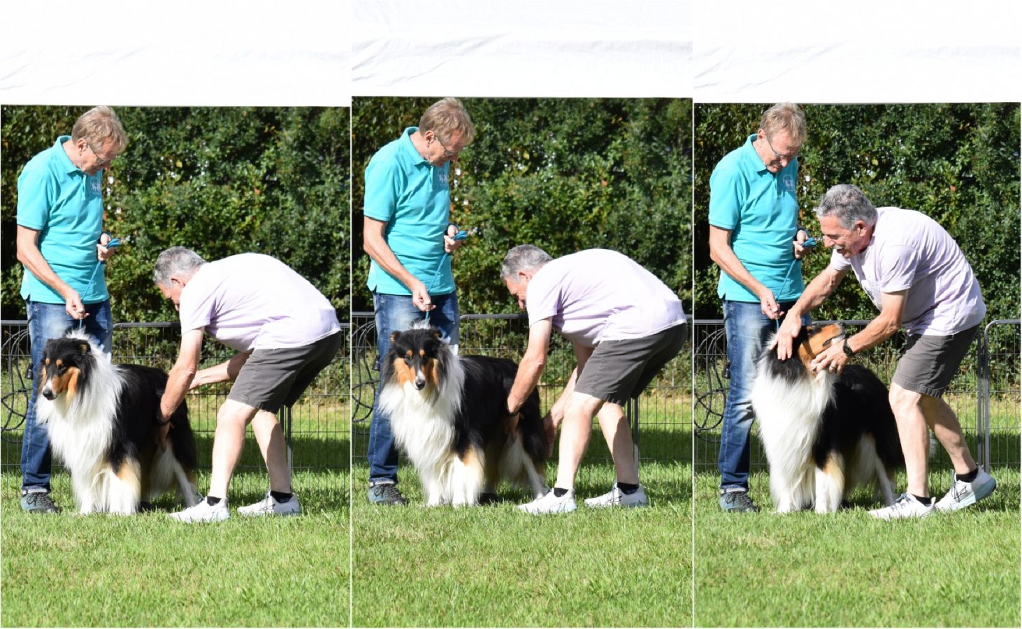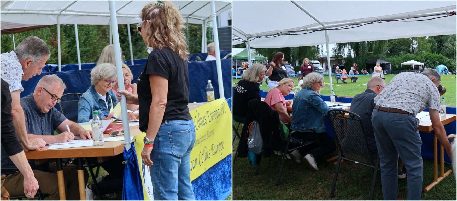 The two hours passed by quickly. Those who had time were able to help themselves to coffee, sandwiches, and cake. The VdH Oberhausen-Rheinhausen has, as always, made perfect provisions. More delicious food is served at lunchtime. After the welcome and introduction of our judge, the judging begins. As part of the assessment, Joe Reno dictates a judge's report for each individual dog. We are very grateful to Ken for agreeing to write them all. But that's not all. Copies must be kept, and the place numbers for the placed Collies must be entered on the prepared certificates. The rest receive participation certificates. On the prepared award certificates, the appropriate awards must be checked for the two first-place finishers with sufficiently good conformation scores. All documents still have to be signed. And let's not forget the important role of the ring steward, who assists the judge during the Show, helps with any communication issues, an ideally also translates the judge's comments when describing the merits of the winner dog of each class, making the event much more interesting for the spectators. Throughout the Show, the photographer takes pictures of all participants.