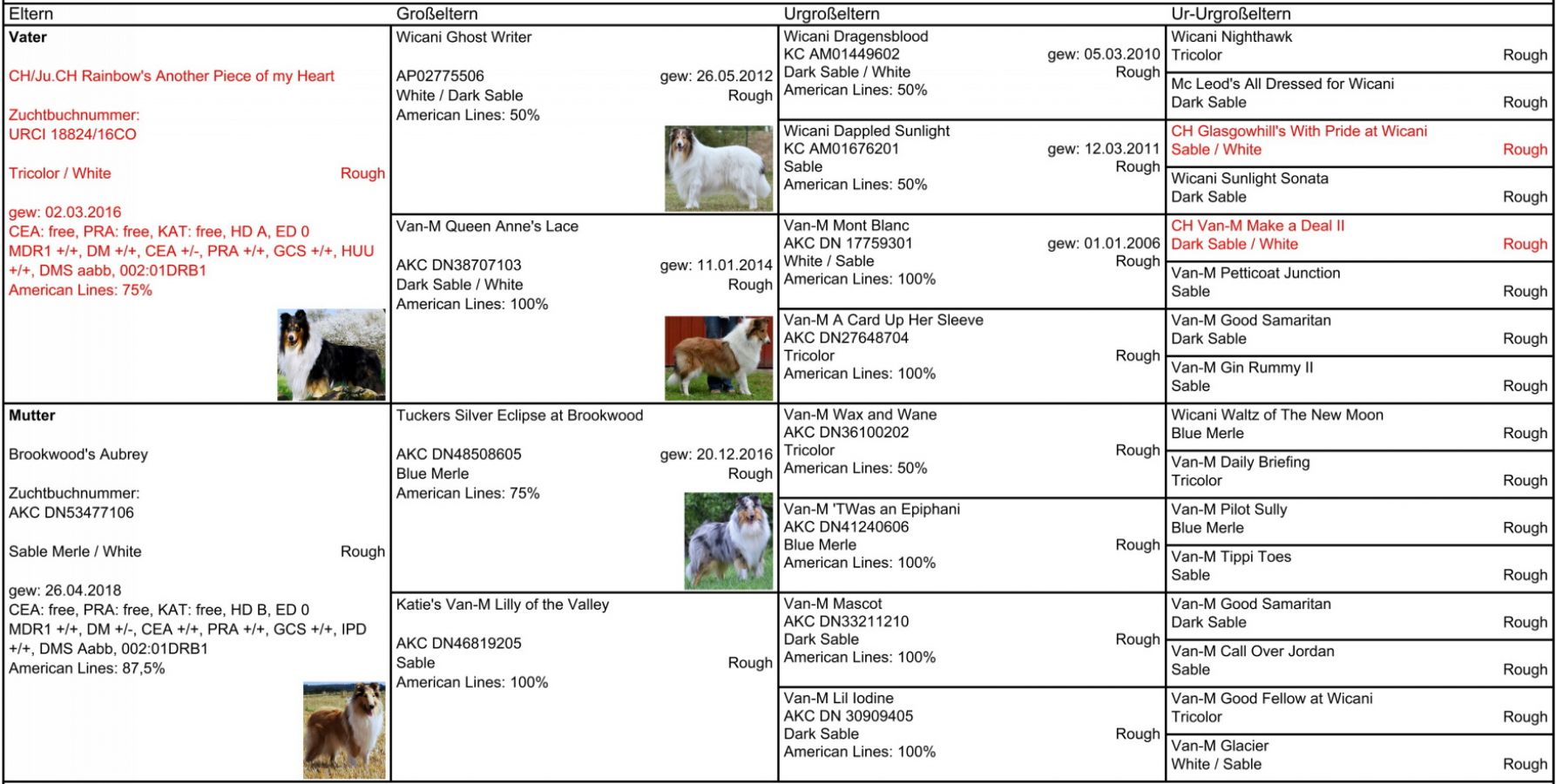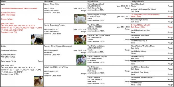 • MDR1 +/+, DM N/DM, CEA N/CEA, PRA N/N, GCS N/N, IPD folgt, DMS aa bb CC, Merle m/[Mc]/M