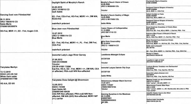 • MDR1 +/+, DM N/N, CEA N/N, PRA N/N, GCS N/N, IPD N/N, HUU N/N, MH N/N, DMS aa bb CC, Merle m/M(267)