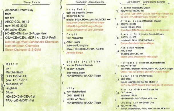 MDR1 +/+, DM N/N, CEA N/CEA, PRA N/N, GCS N/N, IPD N/N, HUU N/N, DMS Aa bb CC, Merle m/m